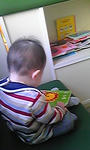 待合室にて、息子、怯えながらも本を読むフリ