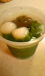中身は、ふるふるの抹茶ゼリーの横につぶあんを添え、上に白玉2コをのせて、それらをゆるーい透明ゼリーで固めたもの。