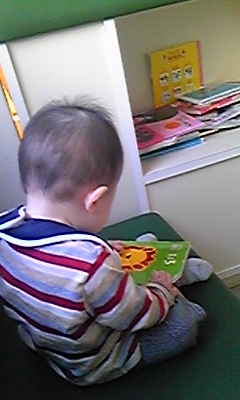 待合室にて、息子、怯えながらも本を読むフリ