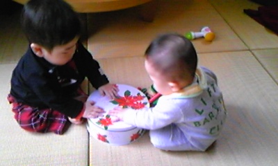 ちなみに写真は、お菓子の丸い缶を2人で仲良く叩いてあそぶ、の図。